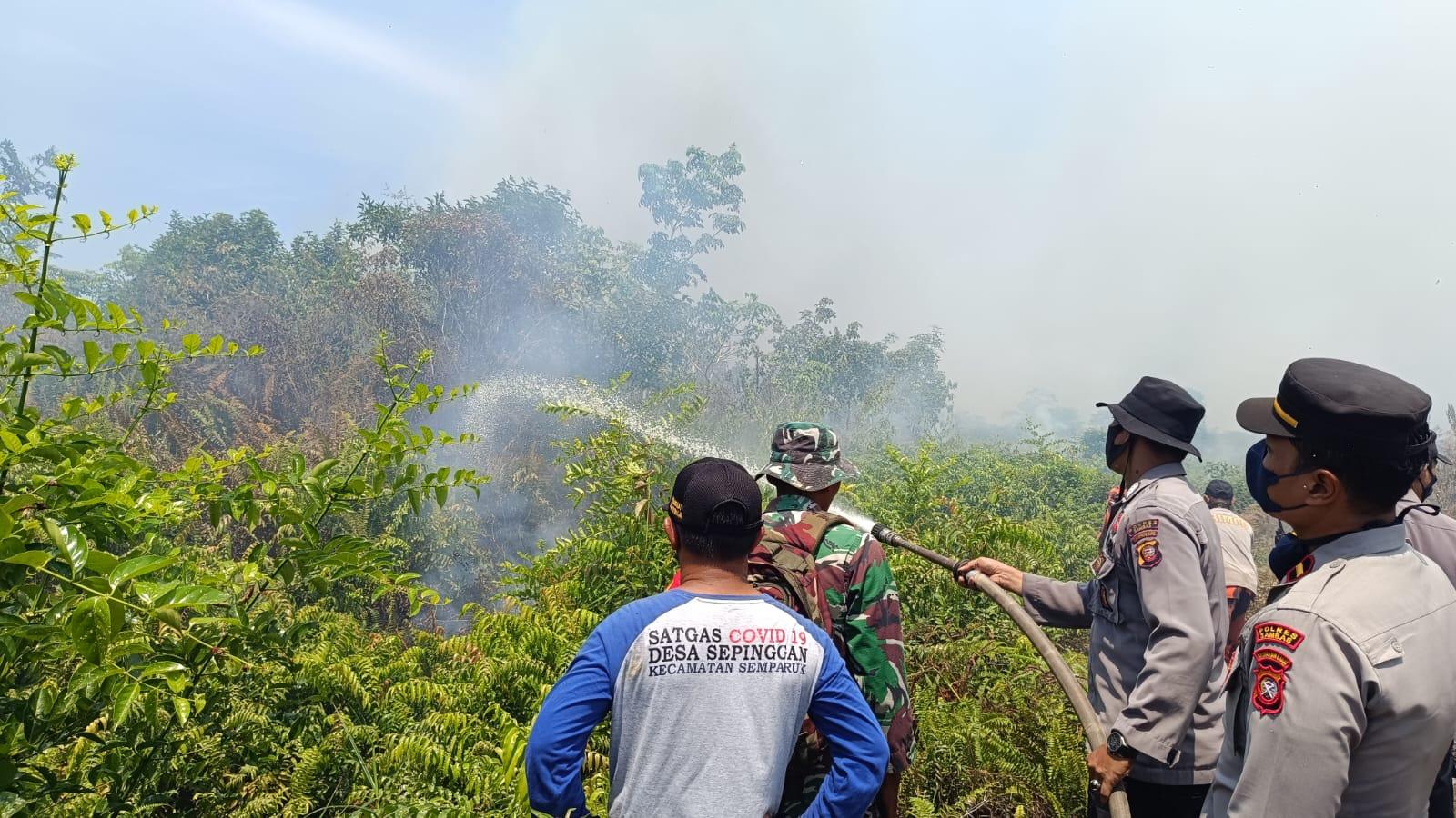 Kapolsek semparuk Ipda Tri Kurnia Setiawan bersama unsur TNI, pemadam, masyarakat dan unsur lainnya berjibaku memadamkan karhutla yang terjadi sejak sepekan terakhir.