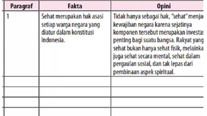 Setelah menemukan fakta dan opini dalam artikel yang berjudul ”Memotret Kondisi Kesehatan Indonesia”, kamu diminta untuk membedakan antara fakta dan opini dengan mengisi kolom berikut ini!