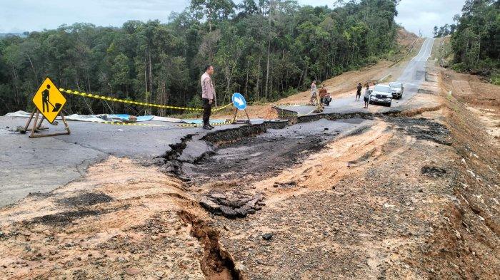 TRIBUNPONTIANAK.CO.ID, SAMBAS - Ruas Jalan Nasional di kilometer 51 Bukit Melintang, Dusun Batang Air, Desa Sentaban, Kecamatan Sajingan Besar, Kabupaten Sambas, Kalbar, mengalami longsor, Kamis 18 Januari 2024.