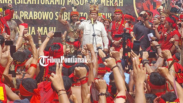 TRIBUNPONTIANAK.CO.ID, PONTIANAK - Calon Presiden Prabowo Subianto menghadiri silaturahmi bersama pasukan merah Tariu Borneo Bengkule Rajakng di Pontianak, Sabtu 20 Januari 2024.