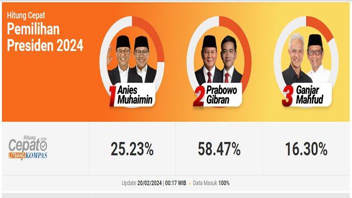 TRIBUNPONTIANAK.CO.ID - Berikut Hasil Akhir Quick Count Pilpres 2024 Litbang Kompas: Cek Selisih Suara Anies, Prabowo dan Ganjar terbaru hari ini Selasa 20 Februari 2024.