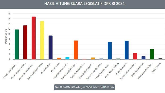 Hingga Kamis 22 Februari 2024 pukul 13:00 WIB Progress: 504540 dari 823236 TPS (61.29 persen).