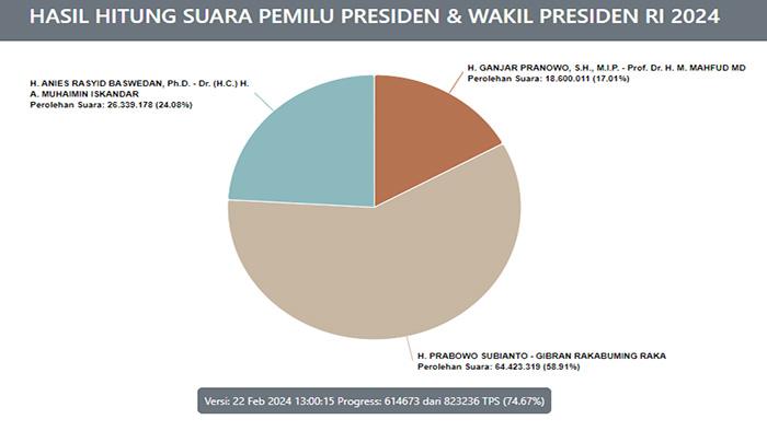 Hal itu berdasarkan data update terbaru pada Kamis 22 Februari 2024 pukul 13:00 WIB Progress: 614673 dari 823236 TPS (74.67 persen).