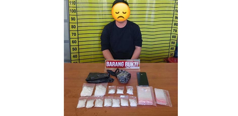 Saat diamankan pelaku sedang seorang diri di dalam kios/konter hp, selanjutnya dilakukan penggeledahan dan ditemukan barang bukti berupa 12 paket kantong plastik klip yang di duga berisikan narkotika jenis sabu yang di dalam satu kantong plastik hitam yang di simpan di dalam rak yang berada di dalam konter/kios.