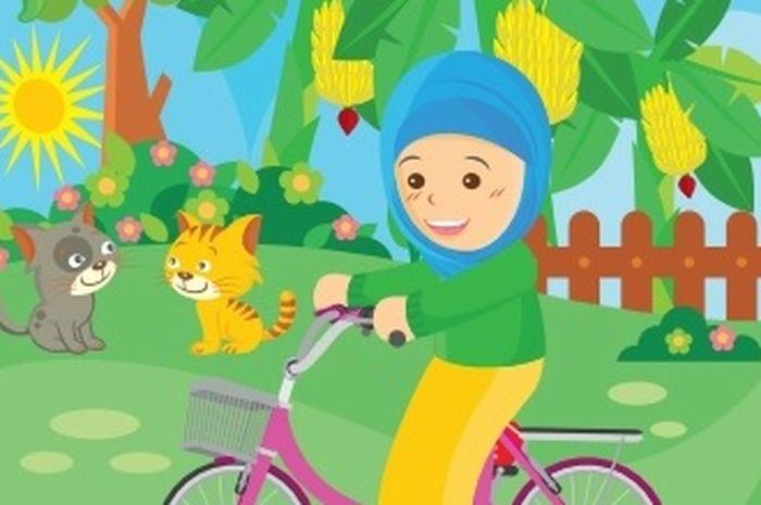 Terjemahan: Aisyah mengendarai sepeda di pagi hari.