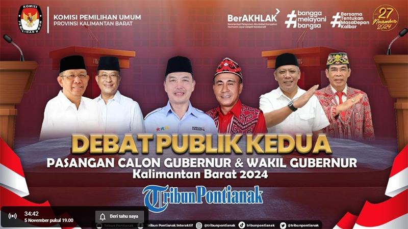 TRIBUNPONTIANAK.CO.ID, PONTIANAK - Tonton siaran langsung Debat Publik ke-2 Calon Gubernur dan Wakil Gubernur pada Pilkada Kalbar 2024 via live YouTube akun resmi Tribun Pontianak, Selasa 5 November 2024 mulai pukul 19.00 WIB. Klik di sini==>