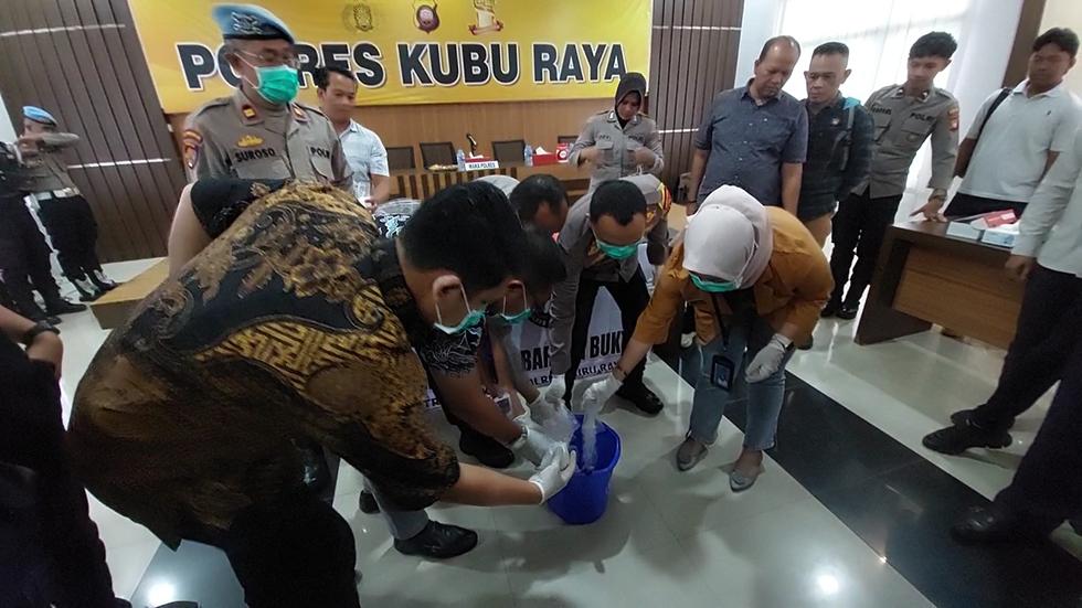 Bertempat di aula Polres Kubu Raya, 2 kg sabu yang diamankan dari 4 wanita dengan modus dimasukkan dalam sendal dimusnahkan dengan cara dilarutkan cairan pembersih lantai, Jumat 21 februari 2025.
