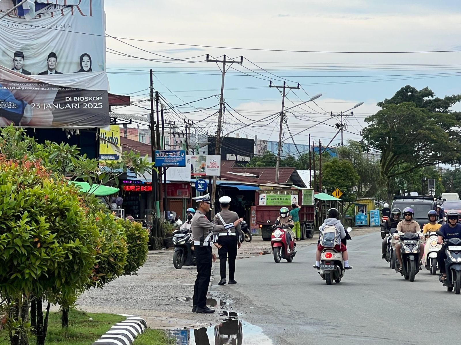 Tidak hanya fokus pada keamanan, petugas juga melakukan pengaturan arus lalu lintas di persimpangan Simpang Vit.