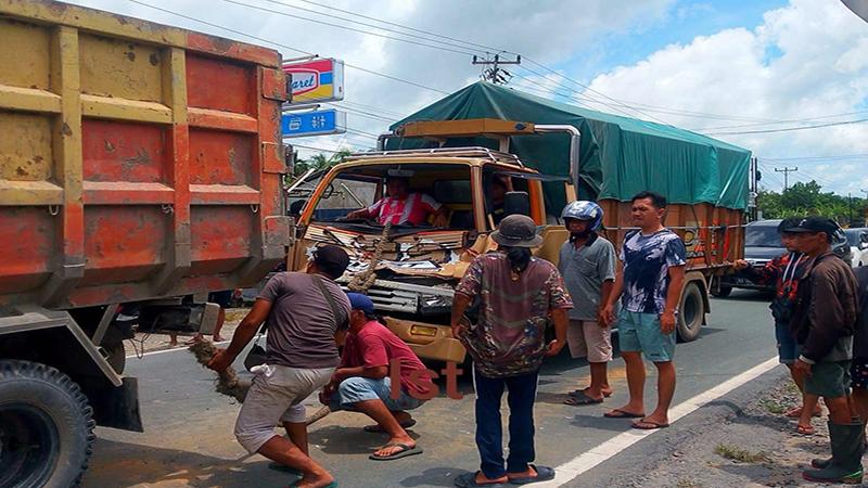 Dia berujar di belakangnya pengendara truk KB 8358 YM dalam posisi berjalan langsung menabrak kendaraan didepannya pengendara dump truk KB 9138 AG/KB 8055 HA.
