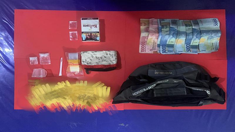 Dari dalam tas itu, petugas menemukan empat paket plastik bening berklip yang diduga berisi narkotika jenis sabu. Selain itu, turut diamankan sejumlah barang lain seperti alat isap sabu, plastik klip kosong, dan uang tunai sebesar Rp 600 ribu yang diduga hasil transaksi narkoba.