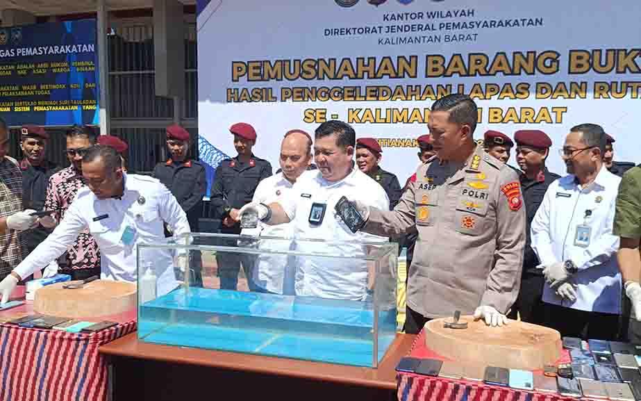 Dalam kegiatan ini, dilakukan juga pemusnahan barang bukti hasil penggeledahan lapas dan rutan se-Kalbar, di antaranya 375 unit HP, 188 power bank, dan 13 unit headset yang digunakan untuk aktivitas terlarang di dalam lembaga pemasyarakatan.