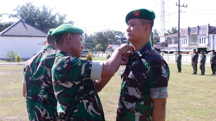 NAIK PANGKAT - Kasdim 1210/Landak Mayor Inf Mino saat menyematkan tanda pangkat saat kegiatan korps raport pada Senin 6 Oktober 2025. Semakin tinggi pangkat yang disandang, semakin besar pula tanggung jawab yang harus diemban.
