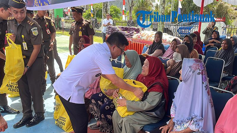 TRIBUNPONTIANAK.CO.ID, SAMBAS - Puluhan warga Sambas dari kalangan lansia dan pra sejahtera menerima bantuan paket berisi sembako di halaman Kantor Kejaksaan Negeri Sambas, Rabu 15 Oktober 2025.
