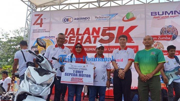 Direktur Utama Askrindo, Andrianto Wahyu Adi saat menyerahkan hadiah utama satu unit motor kepada pemenang, Desi Kusmayanti (39), Minggu (18/8/2019)