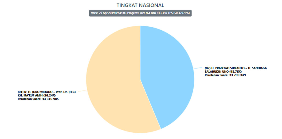 Hasil Real Count KPU 50,37% Pilpres 2019 Senin (29/4), Suara Masuk dari 35 Provinsi dan Luar Negeri