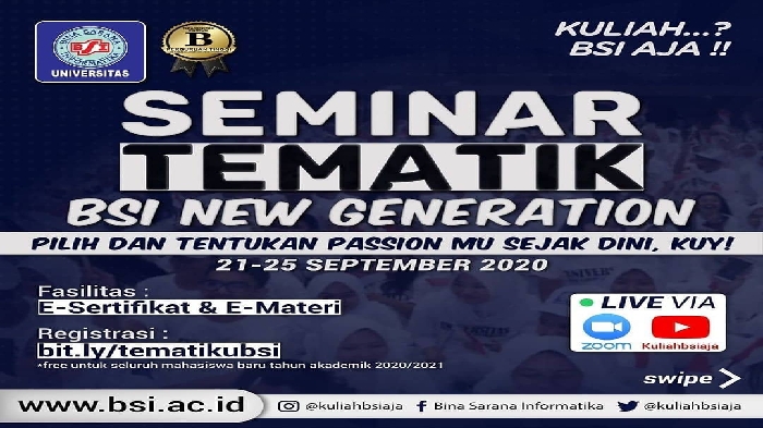 Seminar motivasi (SEMOT) yang diadakan oleh Universitas Bina Sarana Informatika (UBSI) secara online di Youtube Channel 'Kuliah BSI Aja" disambut.